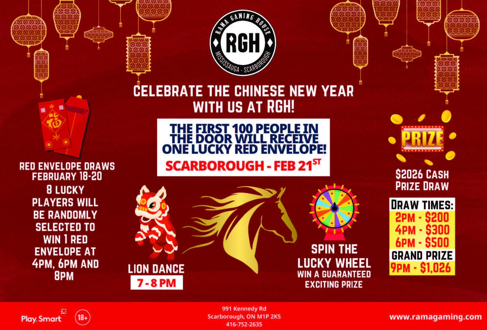 We’re excited to ring in Lunar New Year 2026 at RGH Scarborough with you and share in the prosperity and joy of the Year of the Horse! Don’t miss out on your chance to win big and celebrate local culture in one of Scarborough’s premier entertainment venues.