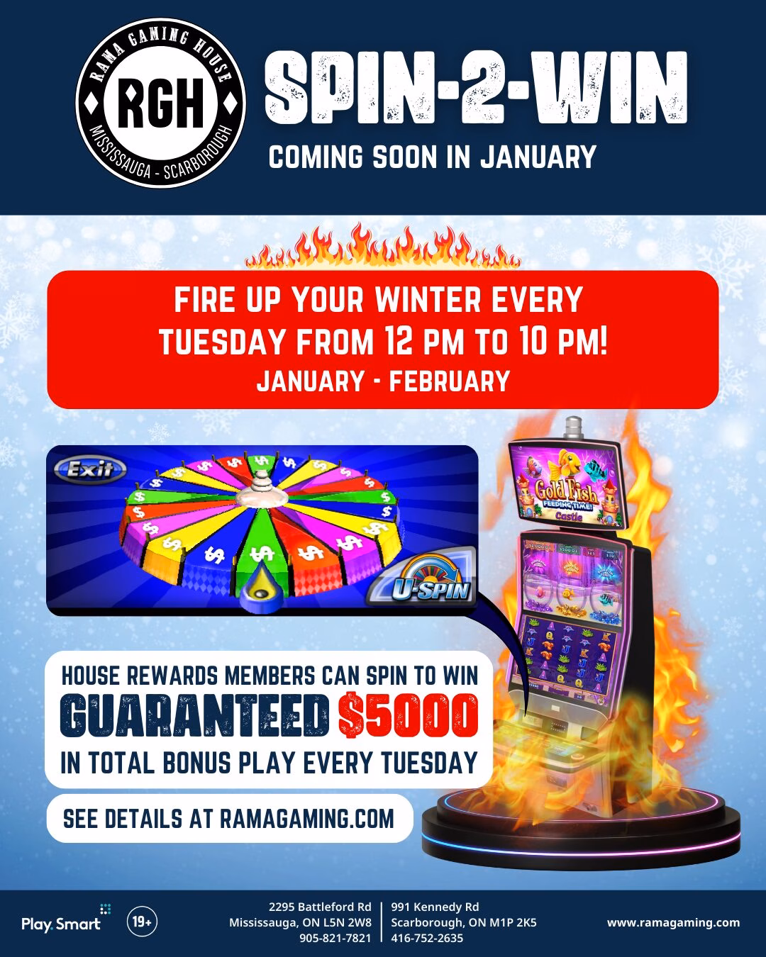 Warm up your winter at Rama Gaming House with our new SPIN TO WIN game rewards system launching this January. Every Tuesday from 12 PM to 10 PM, House Rewards Members can SPIN TO WIN GUARANTEED $5000 IN TOTAL BONUS PLAY. The experience is simple, fun, and designed to give every visit a spark of excitement.